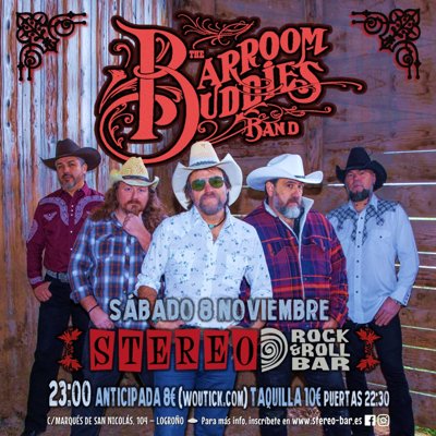 THE BARROOM BUDDIES BAND es una banda original de la provincia de Barcelona formada en 2014, con un estilo honky tonk y country rock 70’s. TBBB combinan gran parte de temas propios con versiones un tanto desconocidas de los grandes del country 60s, 70s en su mayoría.