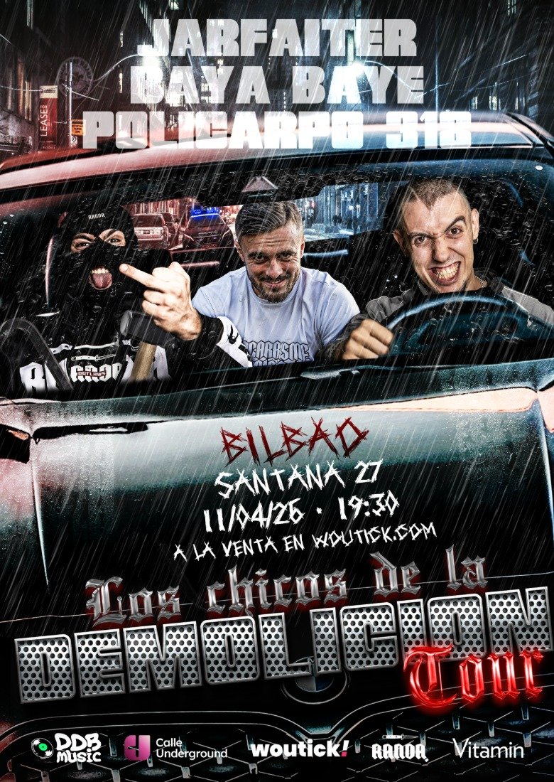 Jarfaiter & Policarpo318 nos traen su gira de presentación de su nuevo trabajo conjunto “Los Chicos de la Demolición”, acompañados de uno de los mayores exponentes del rap catalán como es Baya Baye.